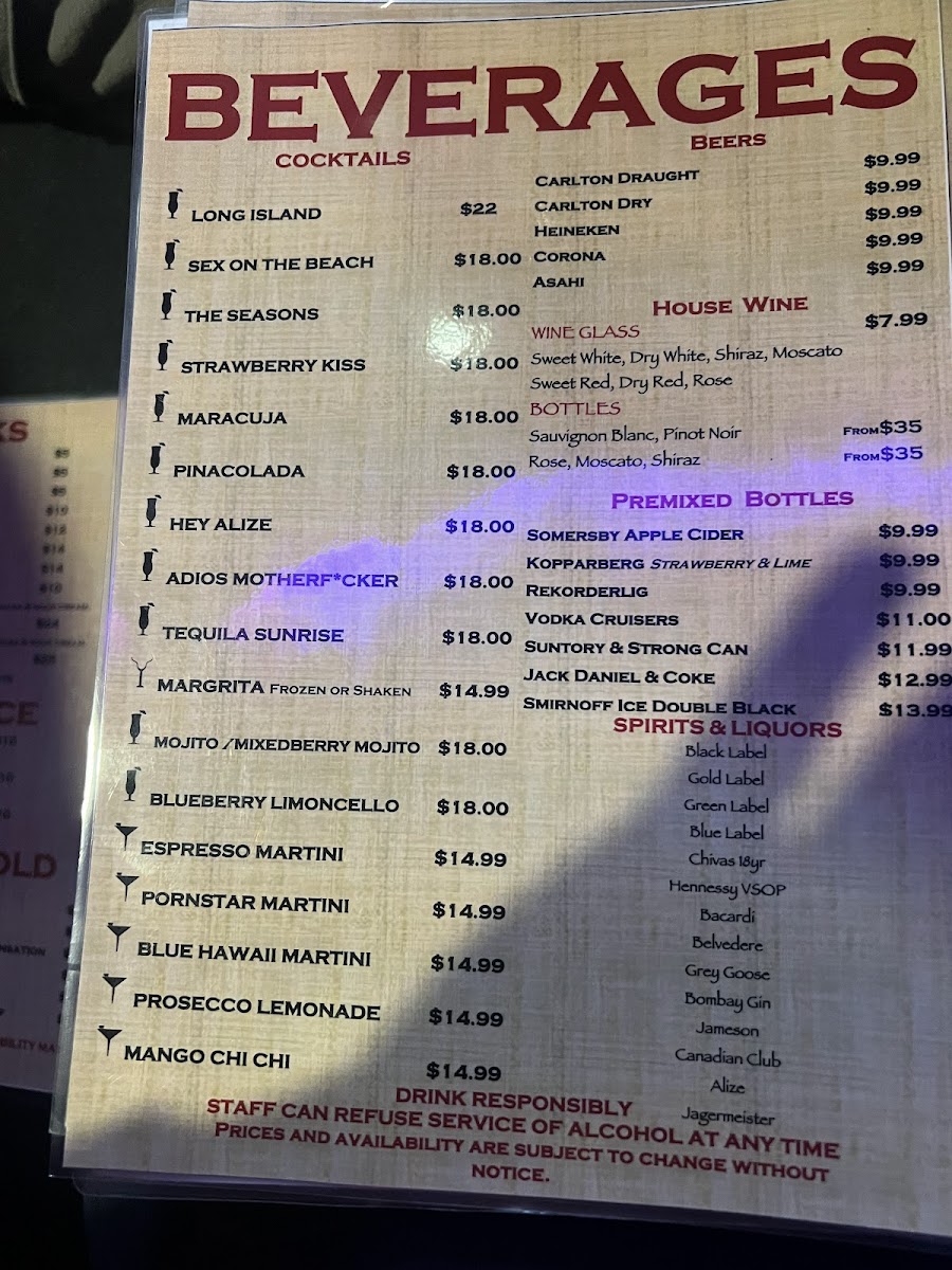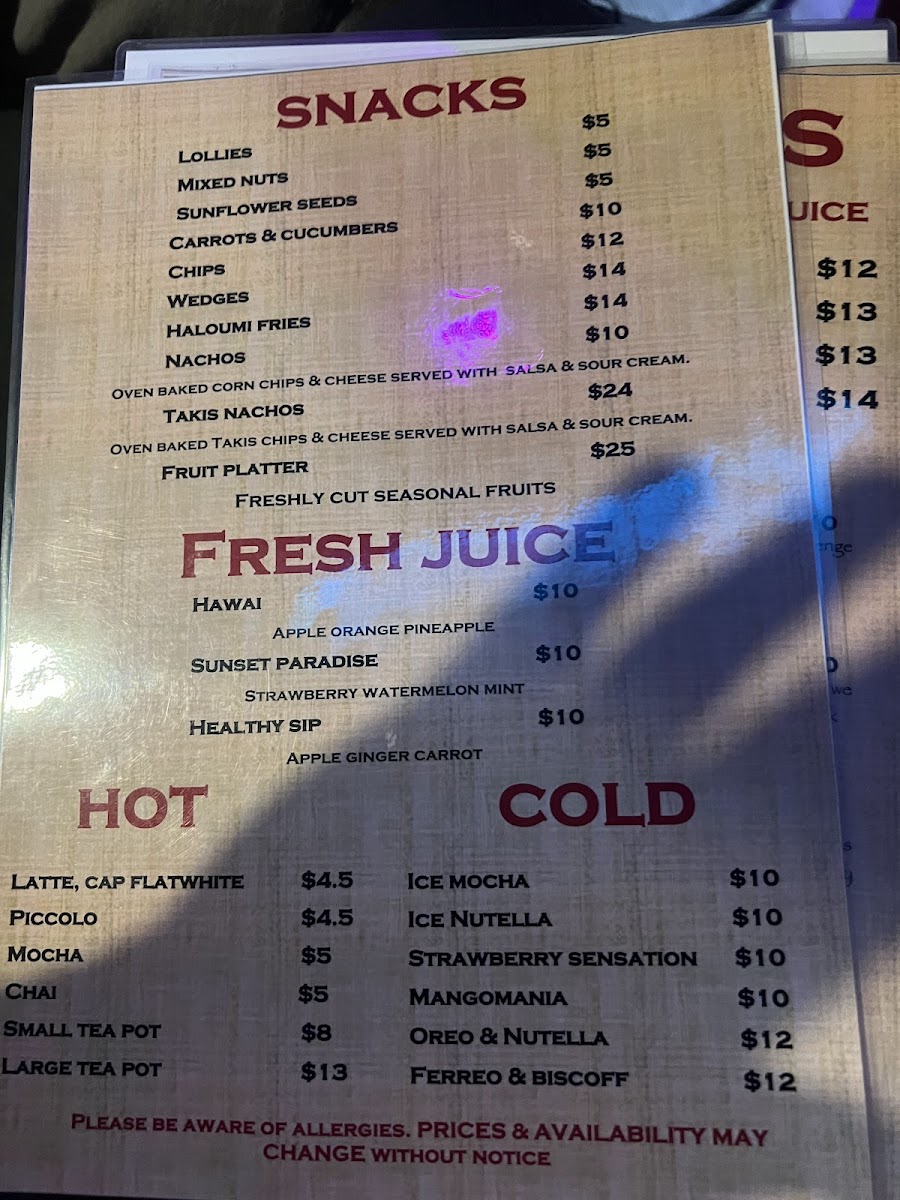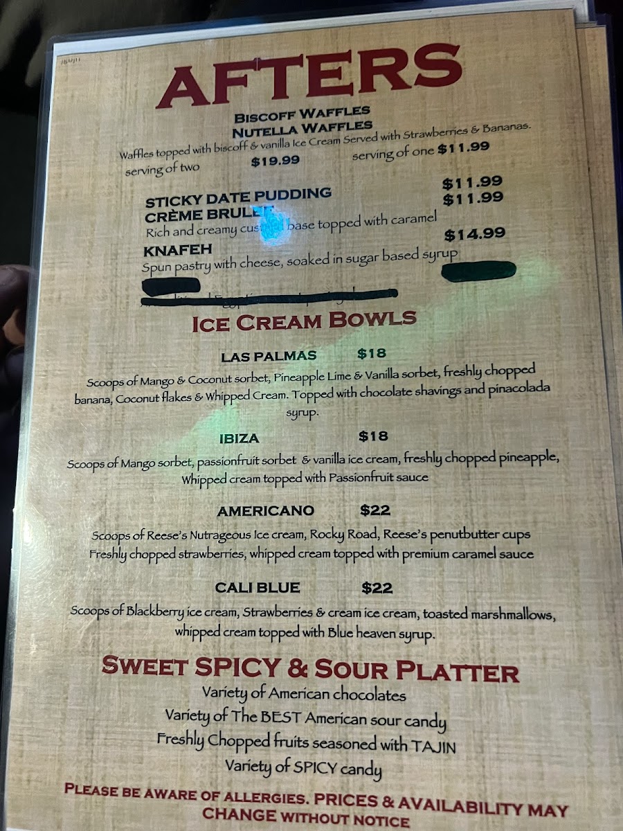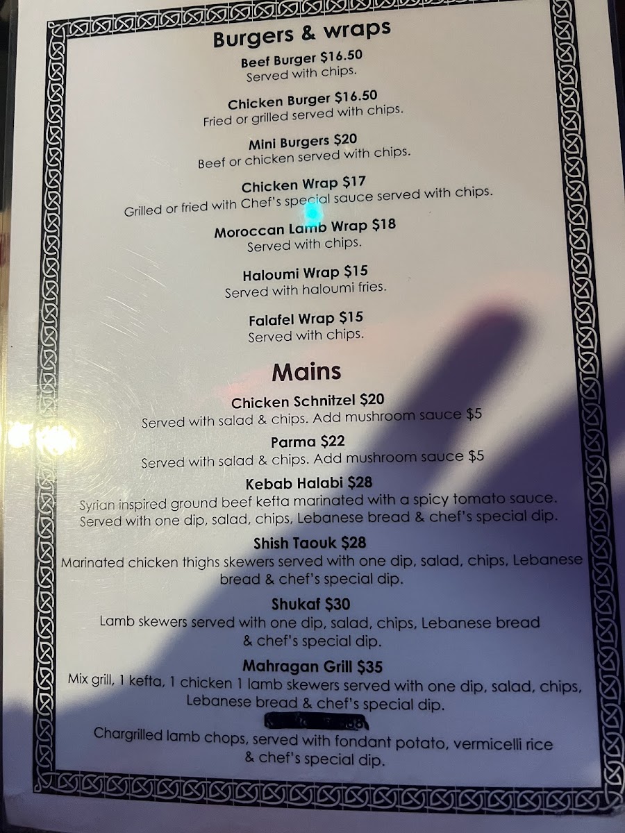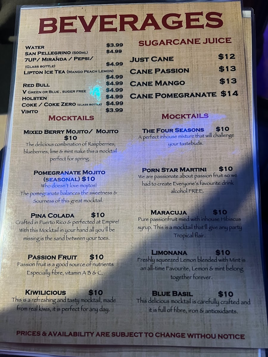 Dining at Empire Shisha Bar is a flavorful journey, with a menu that balances hearty mains, indulgent desserts, and refreshing drinks. The Burgers & Wraps section offers crowd-pleasers like the Beef Burger, Chicken Burger, and Mini Burgers, alongside the Chicken Wrap and Moroccan Lamb Wrap, perfect for a quick, satisfying bite. For more substantial meals, the Mains impress with classics such as Chicken Schnitzel, Parma, and Shukaf, as well as Middle Eastern favourites like Kebab Halabi and Shish Taouk, all promising generous portions and rich flavors. The beverage selection keeps things lively with mocktails including the Mixed Berry Mojito, Pomegranate Mojito, and Pina Colada, providing sweet, tangy, and tropical refreshment. Dessert lovers are treated to indulgences like Sticky Date Pudding and Knafeh, while the Ice Cream Bowls-Las Palmas, Ibiza, AmericanoCali Blue, and the Sweet Spicy & Sour Platter-offer playful, chilled options to finish the meal. Complementing these are simple drinks like Water, San Pellegrino, 7up, Holsten, and Lipton Ice Tea, rounding out a menu that combines comfort, variety, and a touch of exotic flair.
